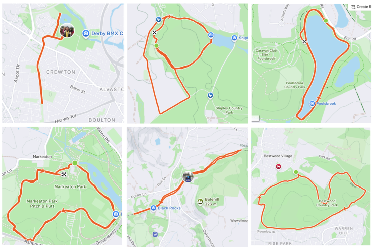 Local Parkruns, clockwise from top left: Alvaston, Shipley, Poolsbrook, Bestwood, Black Rocks and Markeaton