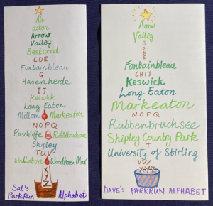 You can keep track of your ever growing list of parkruns with a free app called Running Achievements (Apple or Android; thanks to Helen for the recommendation), or if you’re a luddite like me, you can desgn your own parkrun alphabet Christmas or birthday card. I noticed I can tick off “D” because the original parkrun in Derby was at Darley Park, but moved to Markeaton in 2014. Apparently there is no X, so only 25 letters to collect!