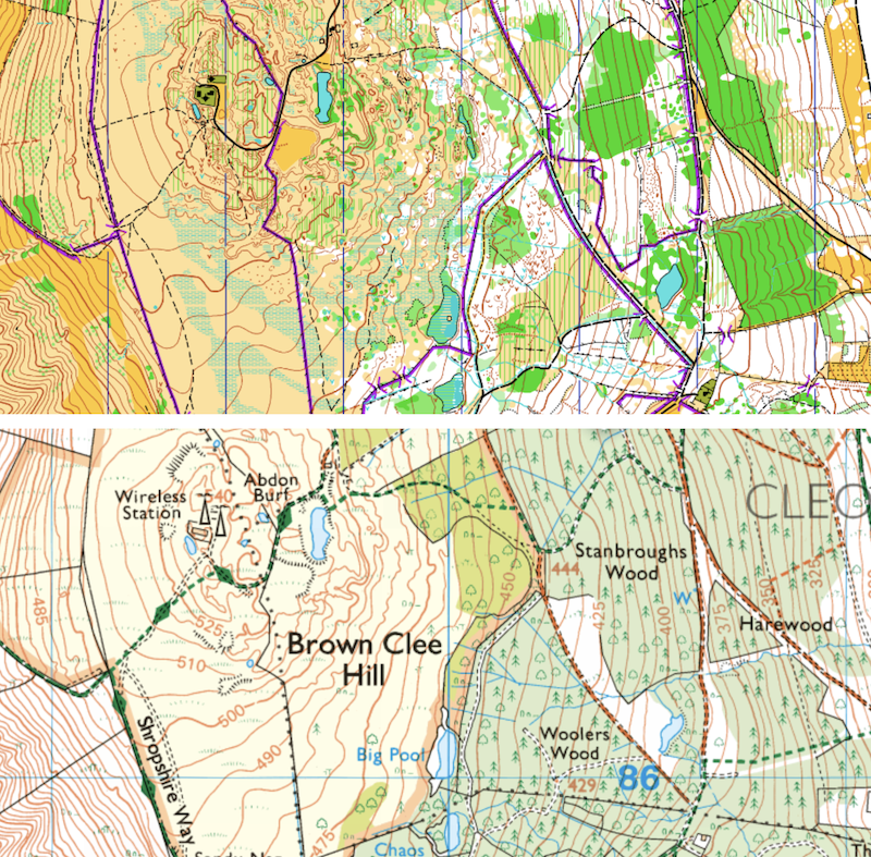 Brown Clee is a varied area, with a complex north-eastern part with contours, marshes and copses chucked in and stirred about at random. The south-west slope is grazed by sheep, with nice parallel marshes and much faster running. On the east side near the parking field and Finish is mixed woodland on a fast downhill slope.